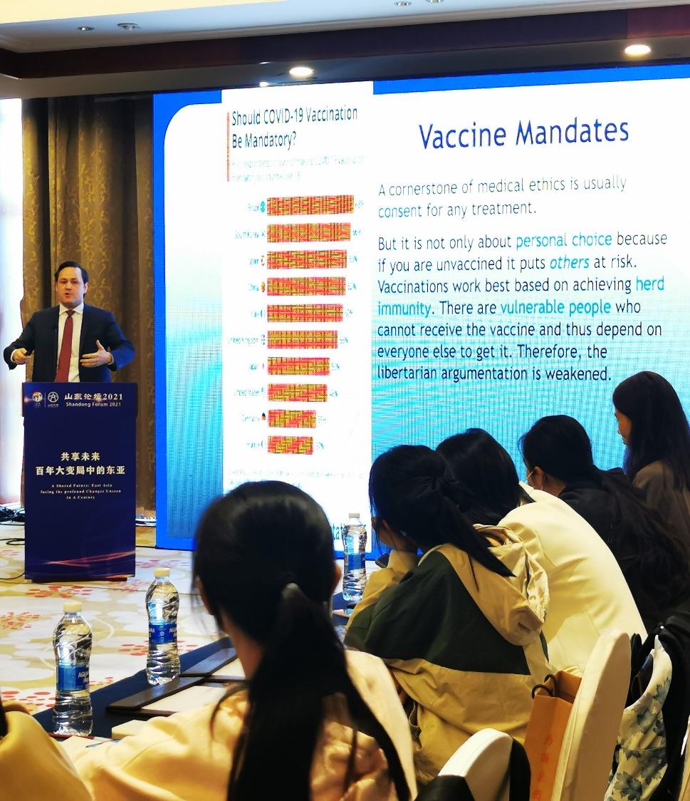 Silley院长指出,疫情发生后,各国针对病毒特性迅速启动疫苗研发并以创纪录的速度成功研制出有效的疫苗,但疫苗在全球范围内的分配却严重不平等。据统计,联合国开发计划署低收入国家的疫苗接种率仅在3%左右,许多东亚国家的疫苗接种也处于滞后状态。与此同时,随着一些国家为恢复经济进行的扩大开放,其报告的新冠病例和死亡人数出现大幅增长。例如泰国和越南在讲座当天报告的新增病例超过了2020年一年的新增病例之和。