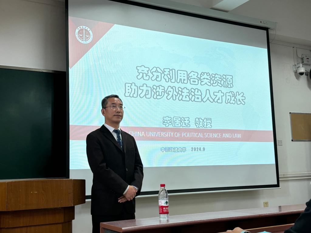 2024年9月6日下午,中国政法大学中欧法学院2024级双硕士新生入学教育的涉外法治人才成长讲座顺利举办。中国政法大学国际合作与交流处处长李居迁教授以“充分利用各类资源助力涉外法治人才成长”为题,勉励2024级全体硕士生新生成长成才。