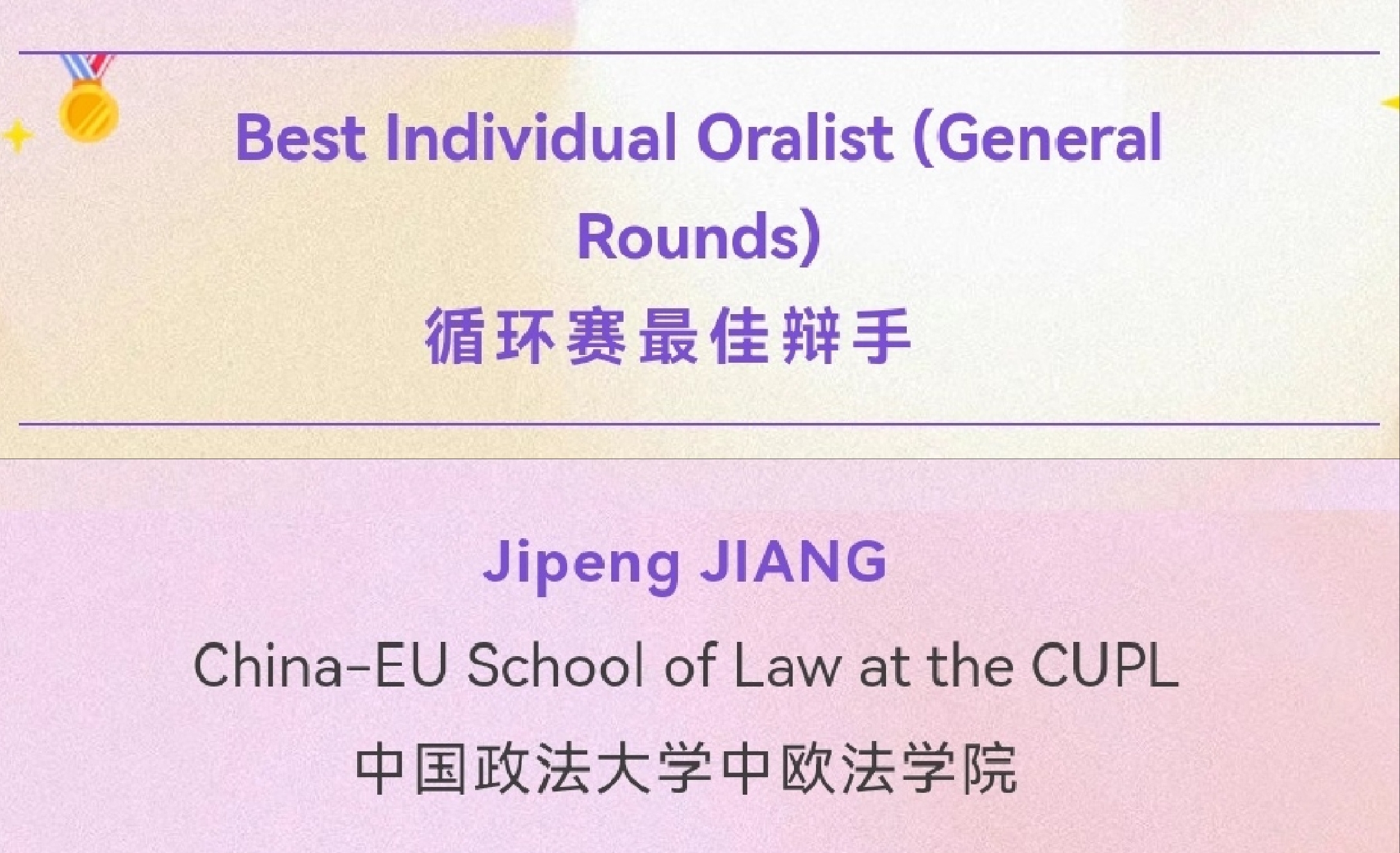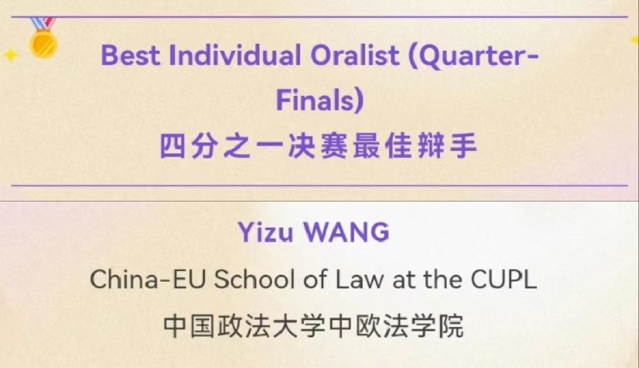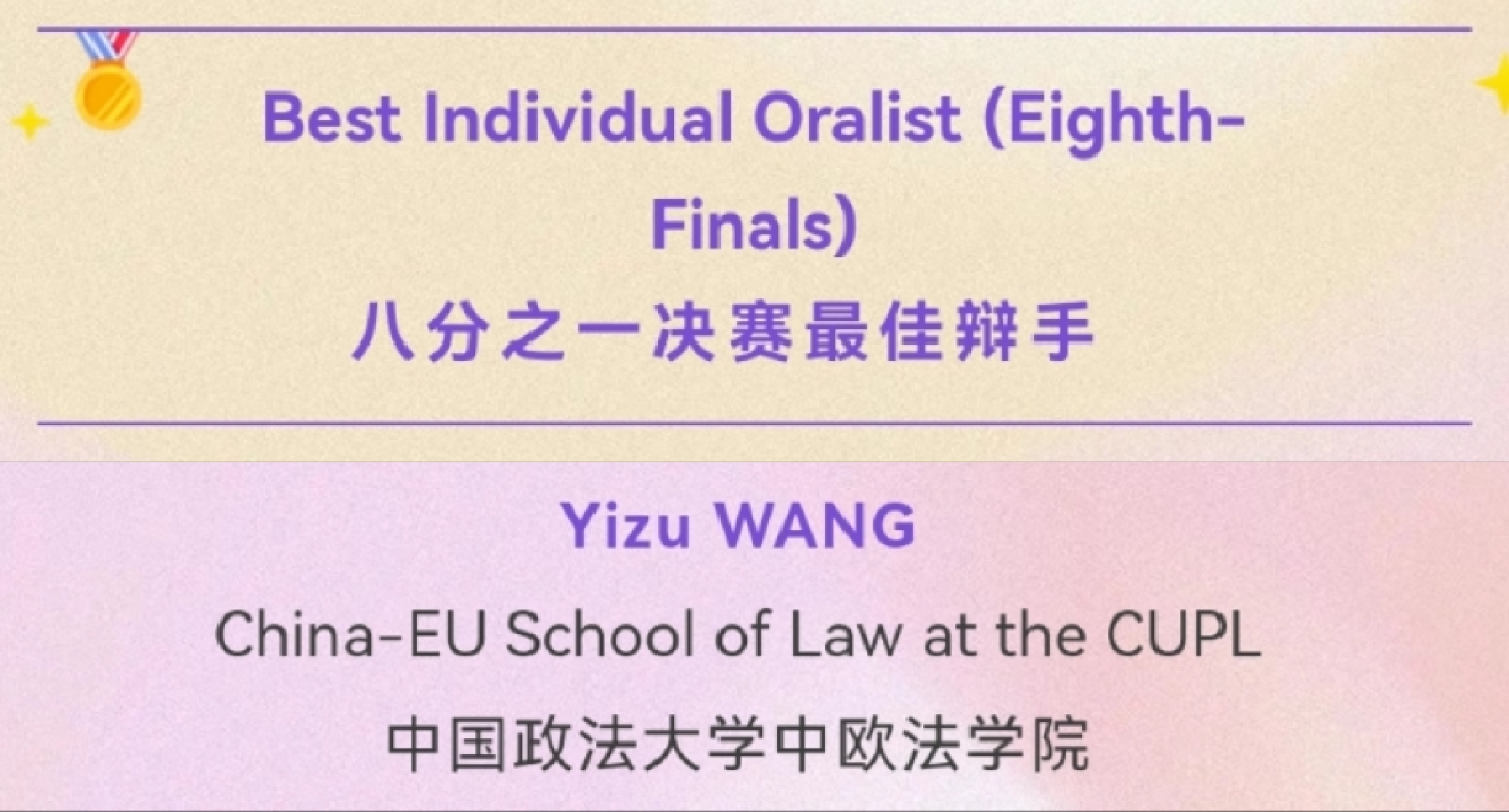 在个人奖项方面,王翼族同学荣获四分之一决赛“最佳辩手”、八分之一决赛“最佳辩手”、蒋吉鹏同学荣获循环赛“最佳辩手”。李涵睿同学荣获“团队突出贡献奖”。荣誉的取得,来自8位队员的精诚合作和不懈努力,特别是6位担任研究员的队员在研究和文书撰写方面的突出贡献,同时在庭辩期间为两位上场队员提供了强有力的支持。