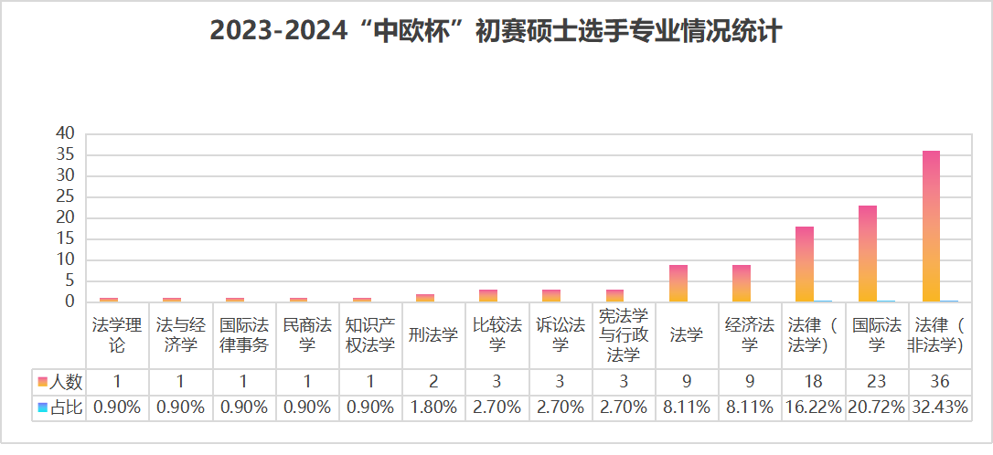 本科生初赛选手来自法学专业。硕士生初赛选手的专业一共有14个。包括学术型硕士,具体为国际法学、经济法学、法学、宪法学与行政法学、诉讼法学、比较法学、刑法学、知识产权法学、民商法学、法与经济学和法学理论;专业型硕士包括法律(法学)和法律(非法学)以及国际法律事务。学术型硕士参赛人数最多的是国际法学专业,占初赛总人数的20.72%;专业型硕士参赛人数最多是法律(非法学)专业,占初赛总人数的32.43%。