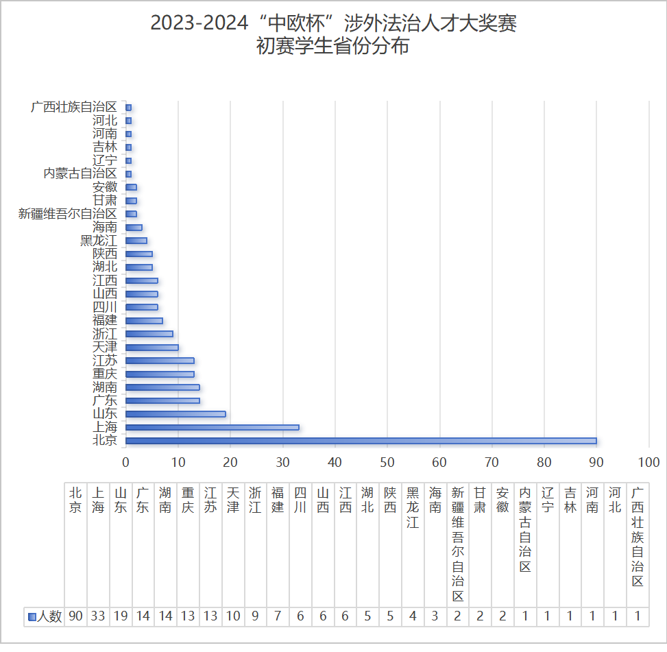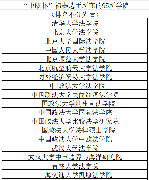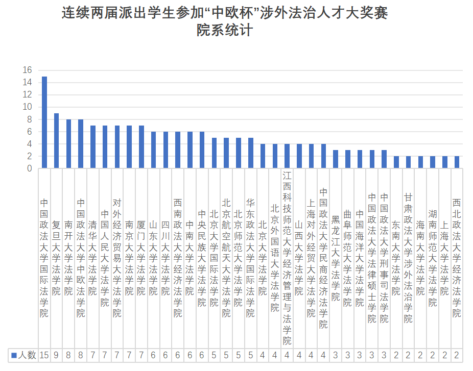 第一届和第二届“中欧杯”比赛中,共有35所法学院连续两届派出学生参加初赛。初赛参赛人数最多的是中国政法大学国际法学院,共有15名同学参赛。其次是复旦大学法学院,有9名同学参加初赛。位列第三的是南开大学法学院和中国政法大学中欧法学院,均有8名同学参加初赛。位列第四的是清华大学法学院、中国人民大学法学院、对外经济贸易大学法学院、南京大学法学院和厦门大学法学院,均有7名同学参加初赛。