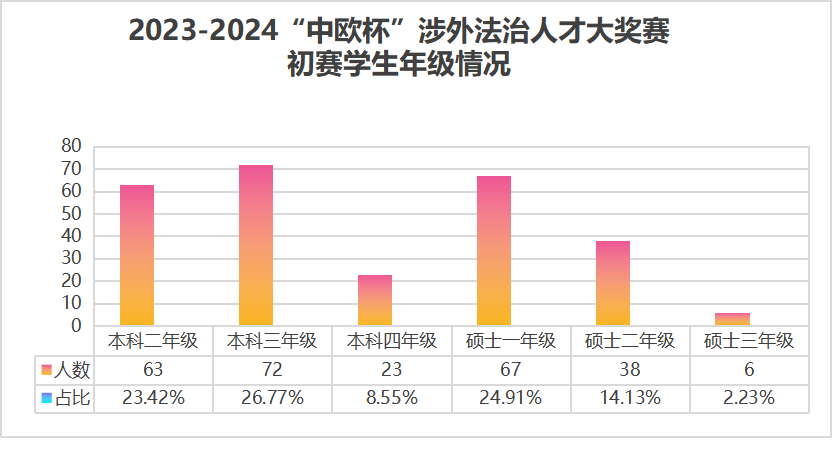 “中欧杯”涉外法治人才大奖赛得到全国各大高校法科学生的广泛关注。两届比赛报名参与初赛的法科学生共计269人。按照比赛通知,选手应是在读法学二年级及以上的本科生或法科硕士研究生。在2023和2024两届的“中欧杯”比赛中,参加初赛的本科生158人,硕士生111人。其中,人数最多的初赛选手来自本科三年级,占初赛总人数的26.77%;人数位列第二的初赛选手来自硕士一年级,占初赛总人数的24.91%。