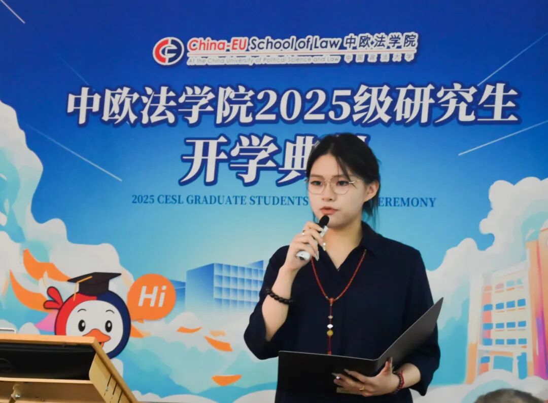 2023级双硕士学生代表陈悦敏回顾了自己两年来的成长历程,并代表全体师兄师姐向新生致以诚挚欢迎。她表示,虽辗转昌平、汉堡、海淀三地求学,但“中欧人”的身份让大家始终心手相牵。陈悦敏分享了学院多元国际化的课程体系、丰富的实践平台与温暖的师生情谊,并强调中欧法学院作为国家涉外法治人才培育基地,致力于培养兼具国际视野与本土情怀的高层次法治人才。最后,她鼓励新生珍惜时光、勇于探索,在这片法学沃土上不负时代、不负韶华。