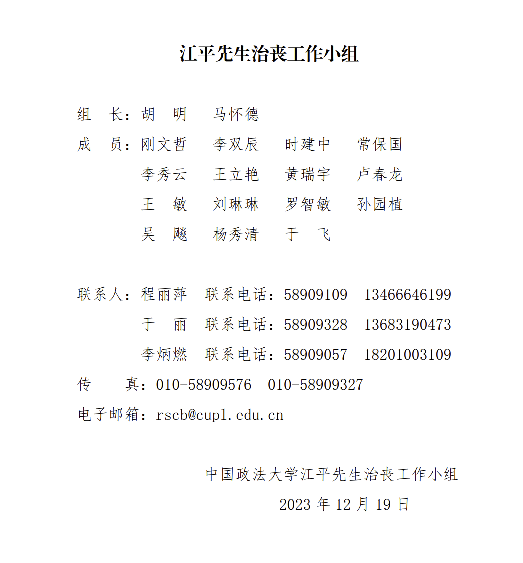 为沉痛悼念江平先生,兹定于2023年12月23日(星期六)上午8:00,在北京八宝山殡仪馆东礼堂举行遗体告别仪式。