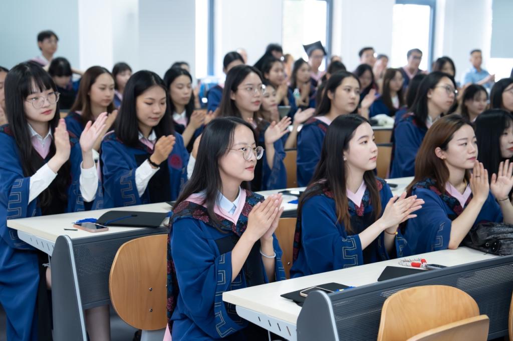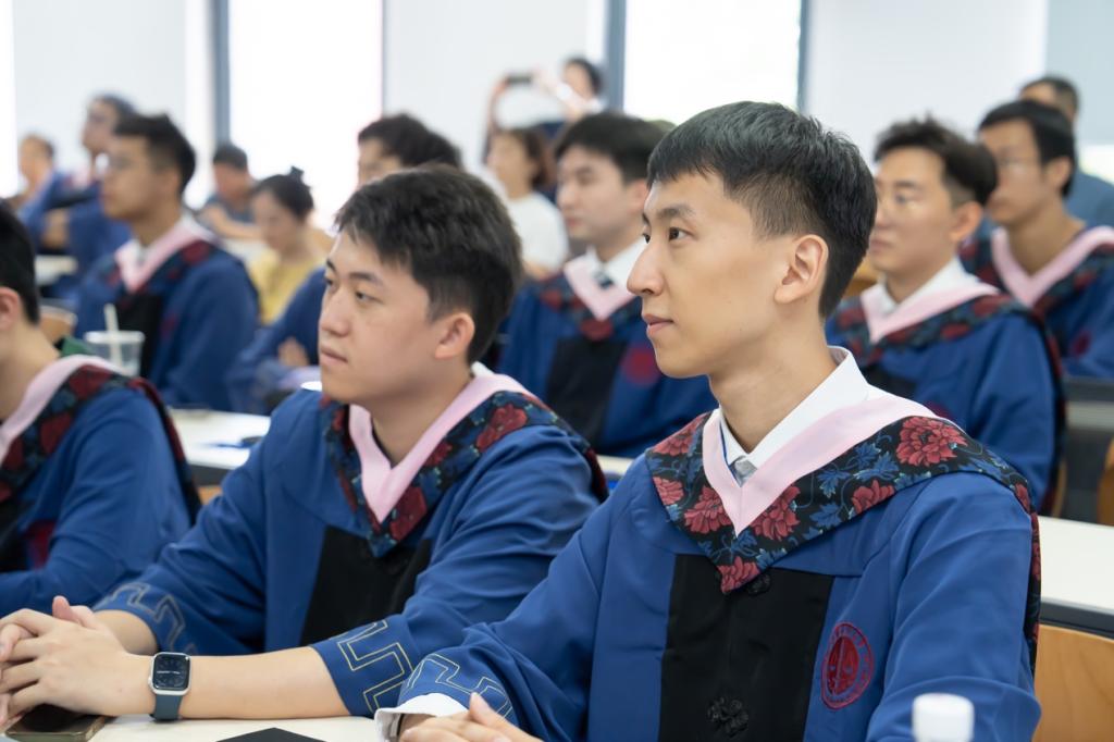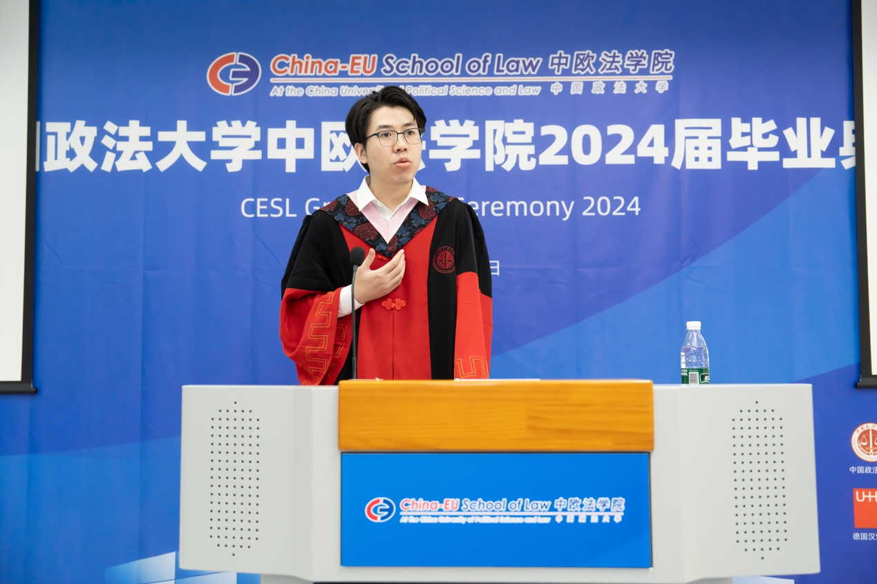 博士毕业生代表谭伟杰谈到,中欧法学院是“千里之行始于足下”的“足下”,而好好把握足下、往足下使劲则是他的感悟。回忆中欧求学时光,老师们带领着他和同窗读书、讨论、郊游。他也曾担任法律方法助教,与同学、师弟师妹们一起研讨,与不同学科背景的朋友一起交流。就是在这些伸手可及的真切交往中,他潜移默化地学会了怎么读书,然后又慢慢知道怎样捕捉理论问题,自主地开展研究。他建议即将踏入职场的毕业生们要从足下做起,脚踏实地、砥砺前行。最后,他表达了对学院培养的感激之情,感谢学院为学子们提供了坚实和优质的出发点,对于2024届毕业生也表达了衷心的祝福与祝愿。