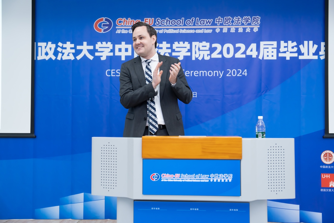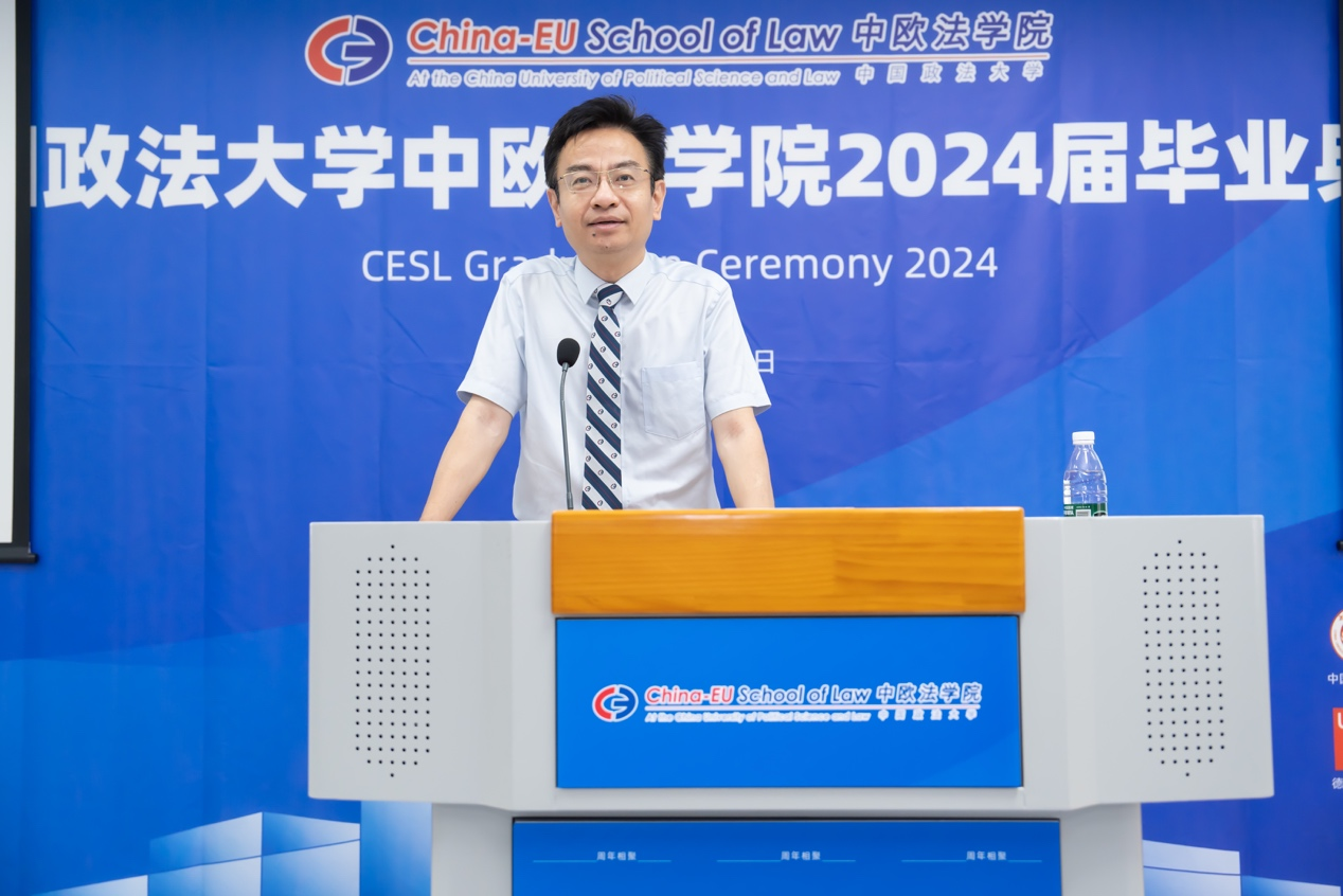 最后,中欧法学院中方联席院长刘飞致辞。他对家长、老师以及各位同学表达了感谢,谈到同学们赴欧留学之路,拥有了非常独特的学习与成长经历,不仅对中国法有了深刻的理解,也对欧洲法有了进一步的认识,中西合璧,为成为涉外法治人才打下了坚实的基础。他总结了2024届毕业生在校期间所获的荣誉与成就,和同学们一起吟诵《行路难》,以“长风破浪会有时,直挂云帆济沧海”祝愿大家,顺境逆境中都应脚踏实地,不磨法律人坚韧底色,成为德法兼修的法治人才,实现自身价值。