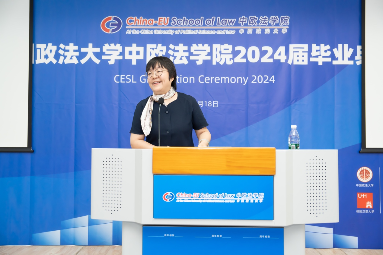 教师代表、法律硕士学院副院长刘智慧教授在致辞中回忆三年点滴,提出三项寄语,赠给即将远行的2024届毕业生。刘智慧老师带领同学们回顾三年来时路,让大家再次捕捉到学习生活的每一个细节,肯定了同学们在课堂上提出的独到见解,在讨论中并发出的智慧火花,在实践中展现出卓越的专业素养。同学们求学过程中的努力和贡献、每一次活动和每一个成就令人印象深刻,让中欧法学院变得更加生机勃勃,充满活力。刘老师提出了三点希望与祝愿。首先,在全球化的今天,法律的影响早已超越国界,希望同学们在未来的职业生涯中能够充分发挥在中欧法学院求学过程中具备的独特优势,为全球法治建设贡献自己的力量。其次,希望毕业生们保持对法律的热爱和追求,以专业的知识和公正的态度,为社会的进步和发展贡献自己的力量。最后她祝愿同学们脚踏实地,为青年、行致远,成为自己理想的模样。