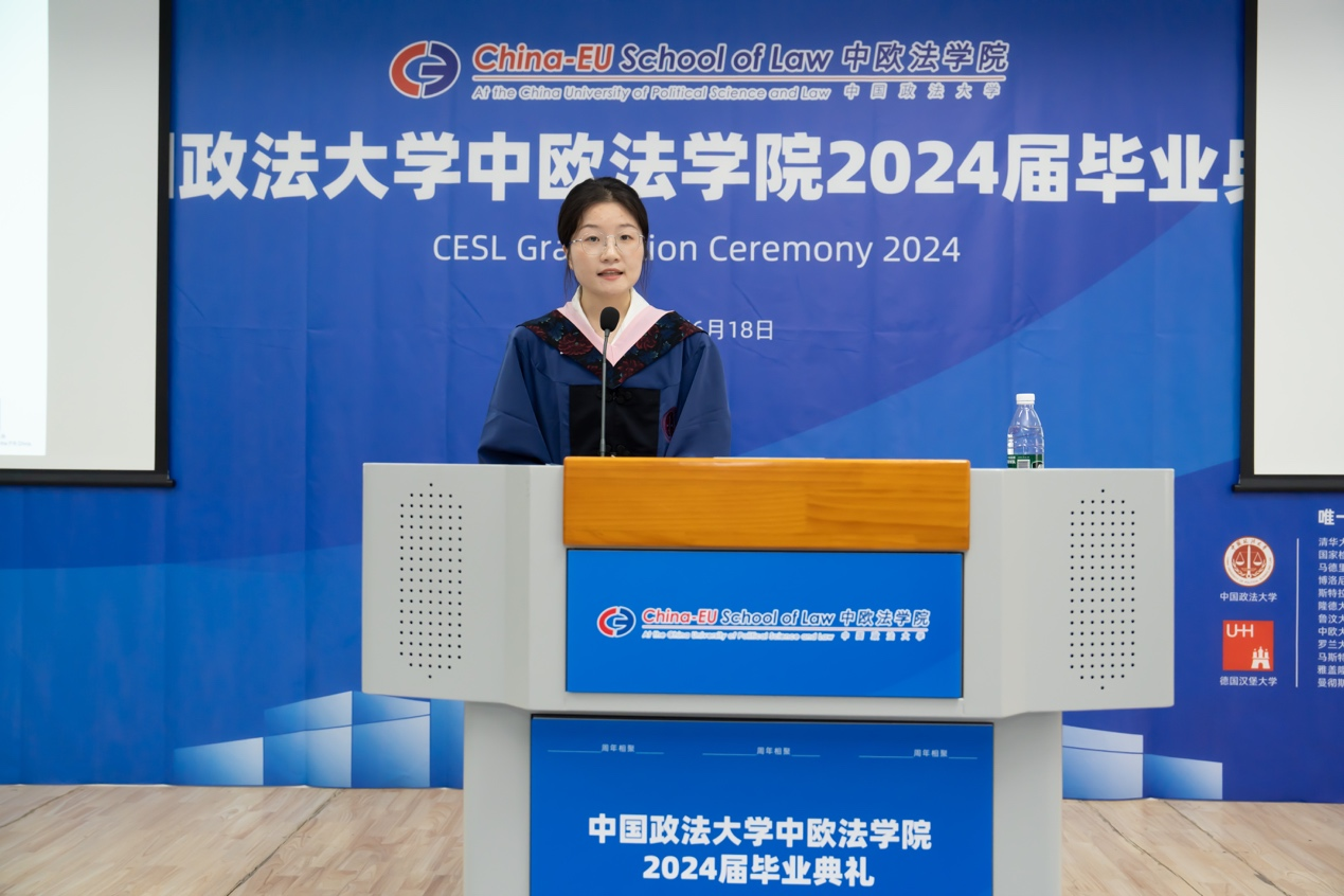 首先,由双硕士毕业生代表段嘉玲发言,她回顾中欧三年求学之路,犹记初见中欧那天的和煦秋日。指出中欧法学院总是能够让同学们跳出舒适圈,每一年都是新的开始,不仅仅是昌平、汉堡、海淀学习环境的切换,更是因为每个学年面临的问题和学习模式的变化。站在毕业分别的路口,细数着这些独属于中欧人的记忆,她以“聚是一团火,散是满天星”作为总结,感谢老师的谆谆教诲,也祝福同学们能够在社会的各行各业发光发热,成为新时代法治中国的建设者,贡献自己的青春力量。
