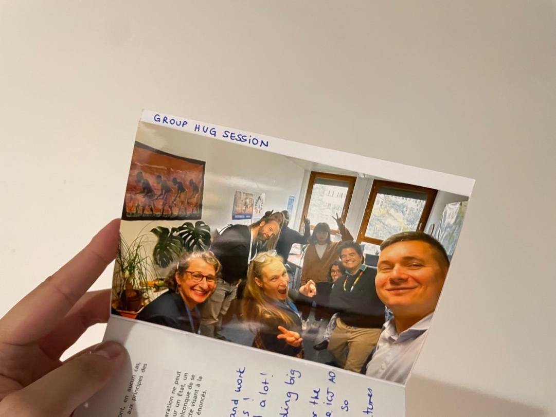 图为团队赠送的联合国人权宪章和Group Hug活动合照