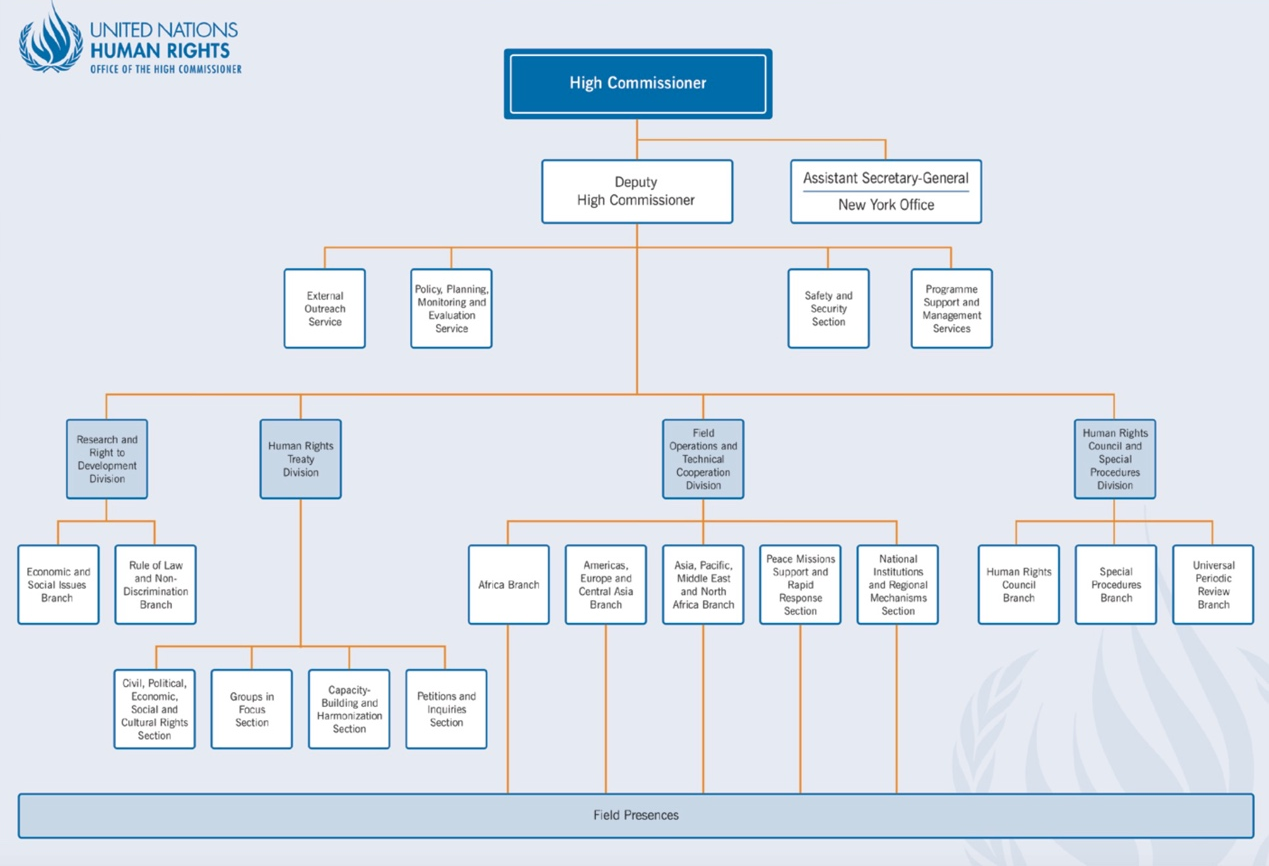 联合国人权高专办由三个实务司和行政领导和管理司组成,后者负责处理管理、规划、协调和外联职能。三个实务司分别是:(1)专题活动、特别程序和发展权司(Thematic Engagement, Special Procedures and Right to Development Division,TESPRDD),负责就各类专题人权问题制定政策,并提供指导、工具、建议和能力强化支持,目的包括将各项人权纳入主流。该司还为人权理事会特别程序提供支持;(2)人权理事会和条约机制司(Human Rights Council and Treaty Mechanisms Division,CTMD),为人权理事会、理事会普遍定期审议机制、以及人权条约机构提供实质性支持和技术支持;(3)驻地业务和技术合作司(Field Operations and Technical Cooperation Division,FOTCD),负责监督和实施办事处的实地工作。
