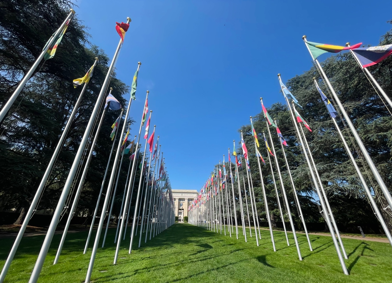 图为联合国日内瓦万国宫飘扬的各国旗帜