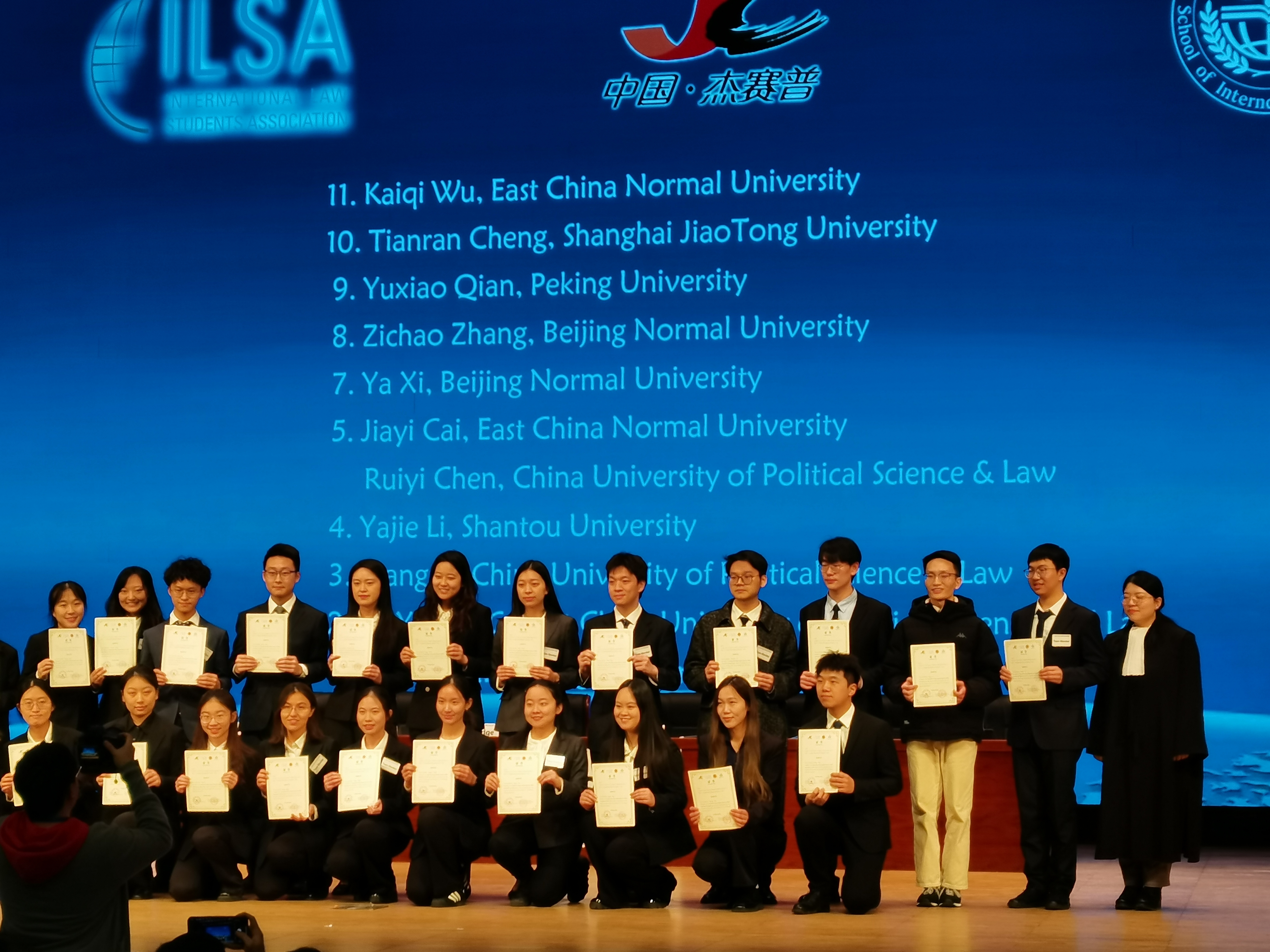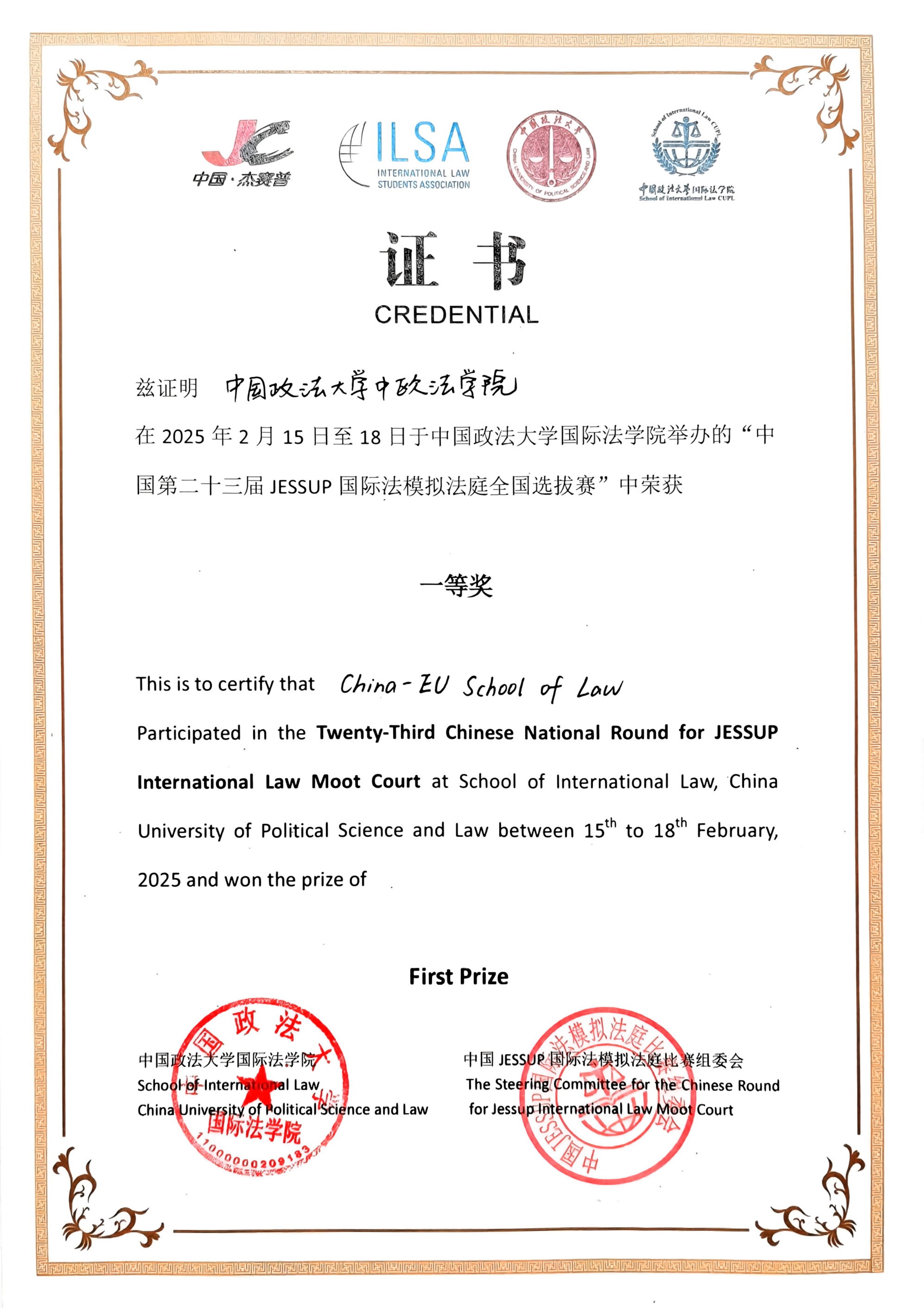 第23届Jessup国际法模拟法庭全国选拔赛(The 23rd Chinese National Round of Jessup International Law Moot Court)于2025年2月15日至18日在我校海淀校区举行,作为首次报名参加杰赛普(Jessup)竞赛的赛队,中欧法学院代表队在预赛中四场全胜,最终荣获全国选拔赛一等奖(一等第十)的佳绩,2024级双硕士研究生严习铭荣获“最佳辩手”称号。尽管代表队以一名之差遗憾止步于全国选拔赛,但此次参赛已然开启中欧法学院杰赛普征程之门,为学院未来参赛奠定了坚实基础。