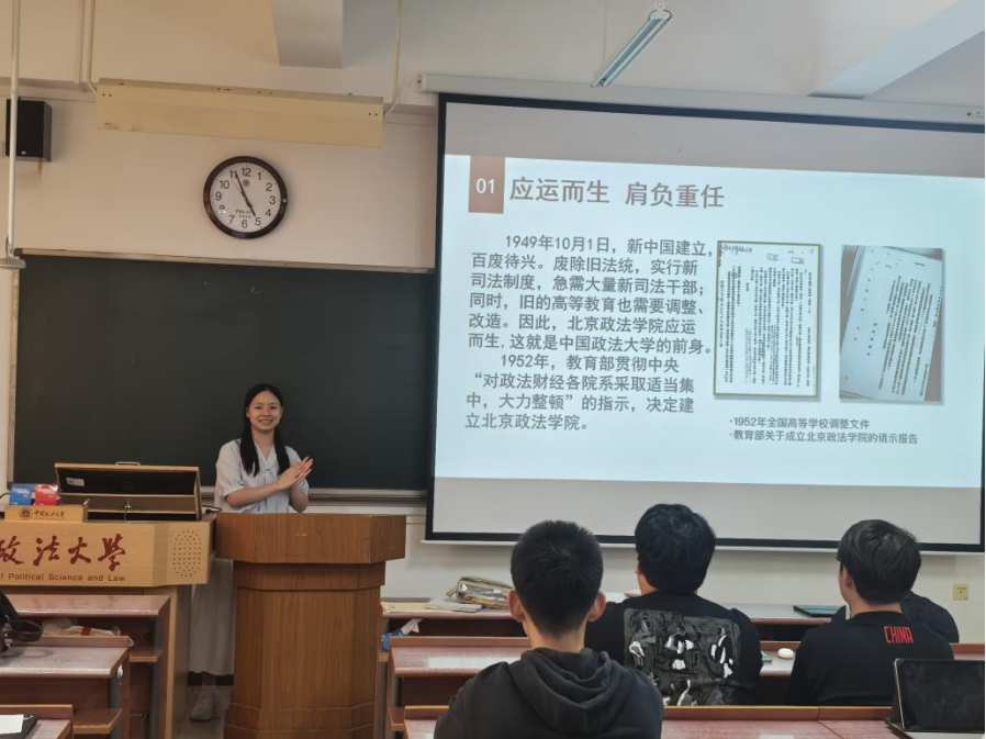 3班的班会从学习习近平总书记的重要讲话开始。全班同学在团支书岳星颜的带领下,共同回顾抗战历程和伟大胜利。紧接着,同学们共同回顾校史,追忆学校七十年来与新中国法治事业同向同行的奋斗历程。