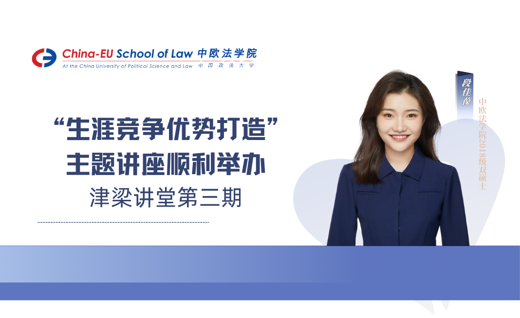 2025年9月18日,中欧法学院第3期“津梁讲堂”系列讲座在线上成功举行。本次讲座以“如何让研究生生涯成为你的竞争优势”为主题,吸引了六十余名同学云端参与。本期讲座特邀中欧法学院校友段佳葆担任主讲嘉宾。段佳葆是对外经济贸易大学法学院博士后、中国政法大学国际法学院法学博士、中国政法大学中欧法学院2018级双硕士,北京市优秀毕业生。主要从事国际环境法、数据法、国际贸易法、国际卫生法等领域的研究。(段佳葆 校友... >>>