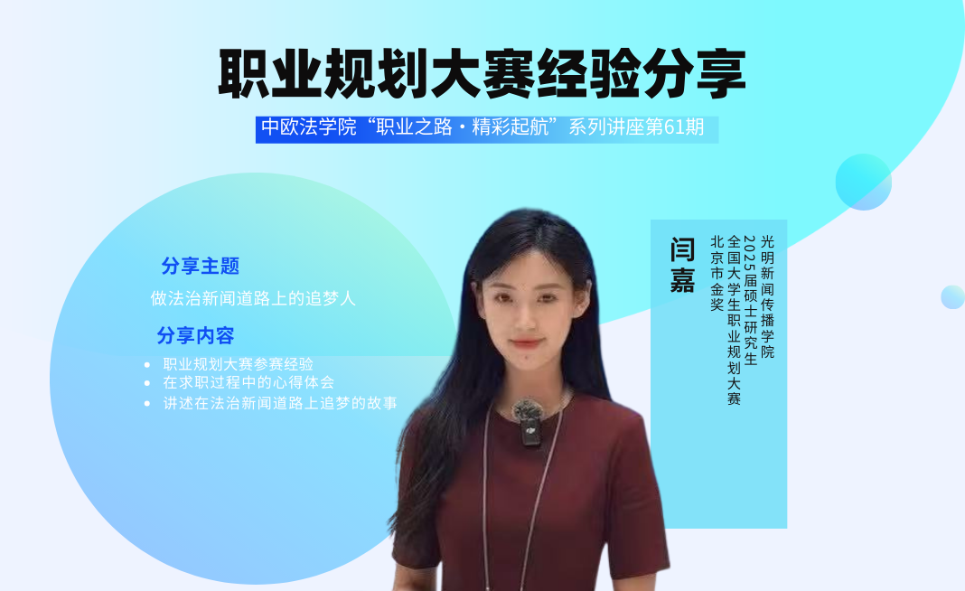 2025年11月20日,光明新闻传播学院与中欧法学院联合举办职业规划大赛经验分享暨第61期“职业之路·精彩起航”系列讲座。光明新闻传播学院2025届硕士研究生、全国大学生职业规划大赛北京市金奖得主闫嘉就职业规划大赛经验和求职技巧与感悟与同学们做了分享。讲座伊始,闫嘉阐述了职业规划大赛的意义与核心,指出竞赛是个人成长历程的总结,能聚焦于个人特质和发展路径,帮助审视和锚定未来,并就参赛过程中PPT制作的核心原则和... >>>